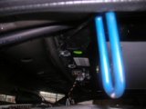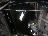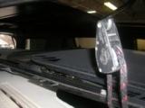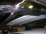 Sunroof Solo The most valuable trick with sunroofs is how to drop them when you're all by your lonesome. This is what I call the rope ratchet cradle trick. Notice the ratcheting ropes used in the front and back of the sunroof. These ropes are available at many home and hardware stores. If you can't find them you can substitute any sturdy adjustable strap. Place the hooks in a hole on the left and right sides of opening. Pull them taut and now you can take off your drain hoses, electrical connections and finally bolts. Remove the bolts in such a way that the front or back comes down evenly. It should catch and rest on the ropes. |